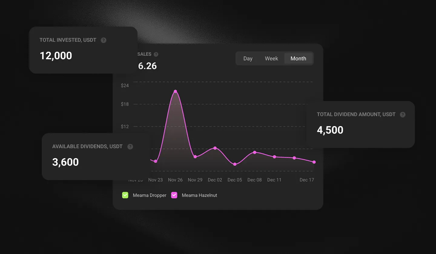 We tokenized Meama’s products, divided them into shares, and connected each share to NFT. Now, private investors can choose NFT of any denomination: 1%, 3%, 5%, and 10% ownership of a single lot, plus minor overheads. 1% NFT represents the minimum investment, equivalent to $150. Also, it’s possible to combine two NFTs: