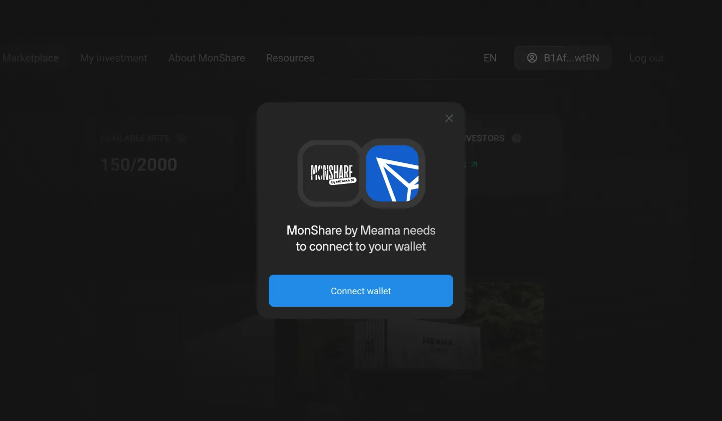 After clicking “Buy,” you will see your wallet interface overlaying the platform page. Then, you can sign the transaction just as you would with your wallet outside MonShare by Meama. If you don’t have a wallet, the platform will prompt you to create one and connect it to MonShare by Meama.